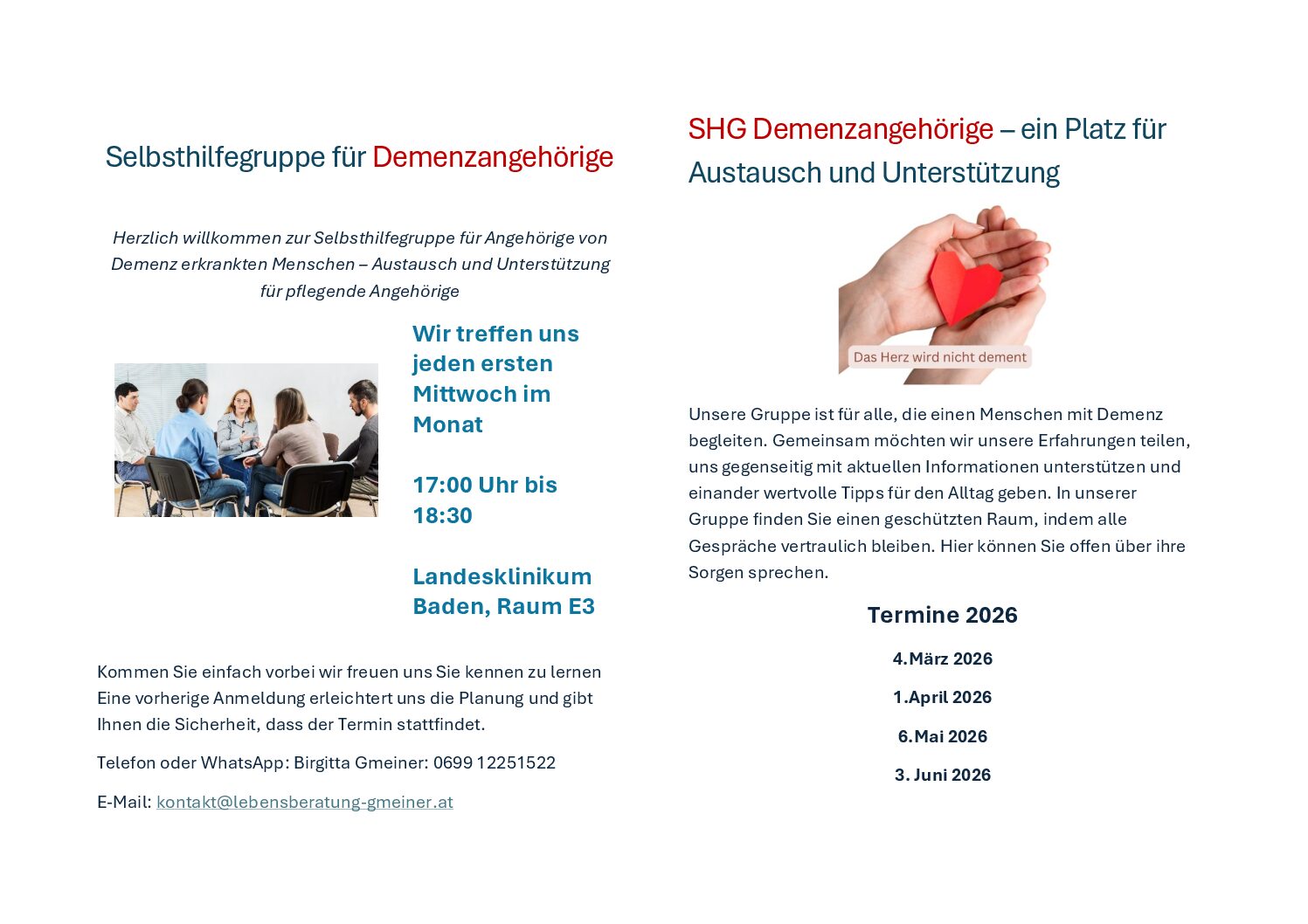 Für Angehörige von an Demenz erkrankten Menschen gibt es im Krankenhaus Baden eine monatliche, kostenlose Selbsthilfegruppe.